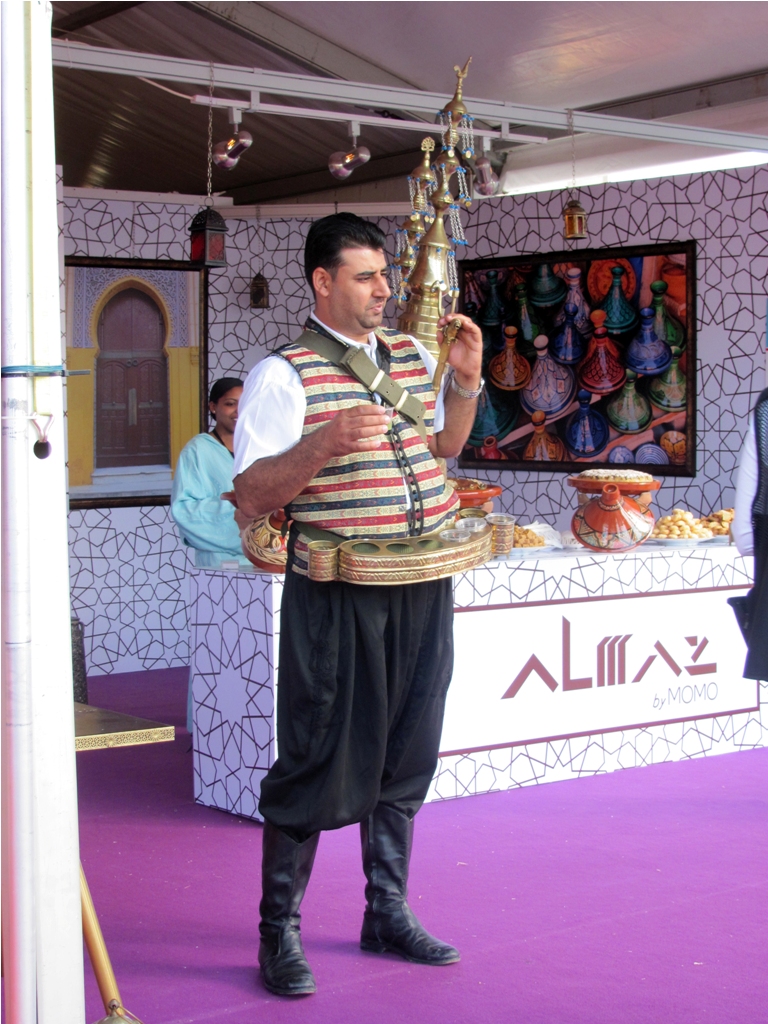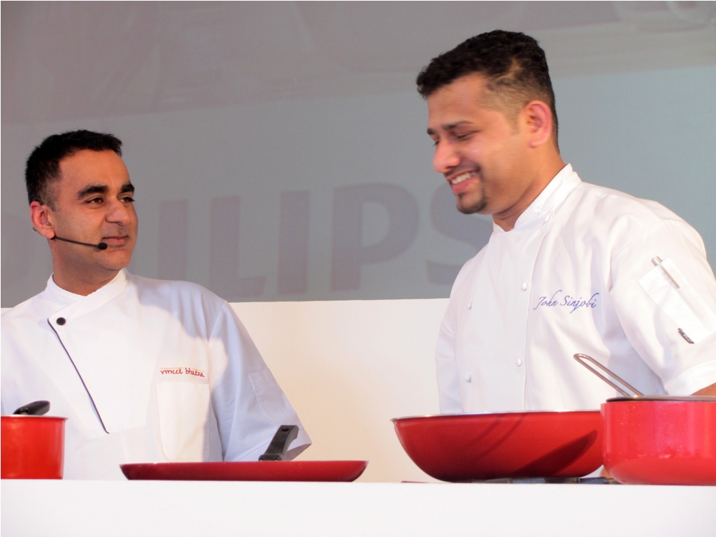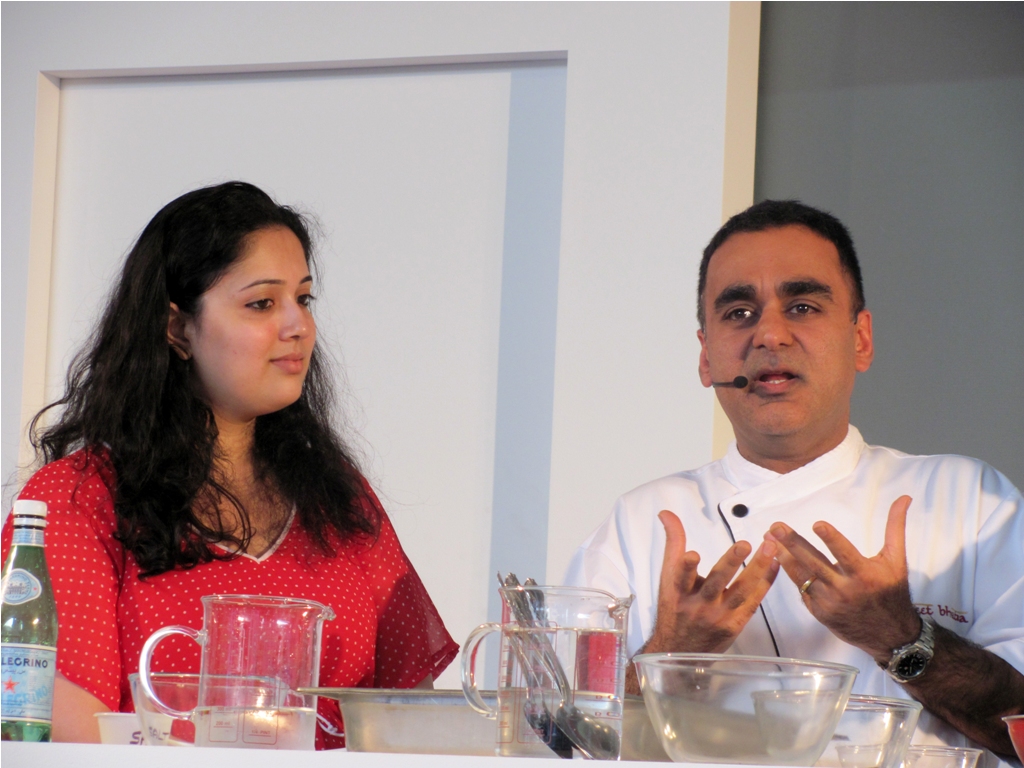 I found the cooking demo area and I perched myself right in front. When Vineet Bhatia asked for two volunteers, it only took a quick moment to get me up on stage. And there I was, up on the cooking demo stage, whisking away. It was a pretty interactive demo, which is how it should be, with the ever-so-humble Michelin starred chef (two time winner!) involving the crowd. Inventive with a capital I, he made a chicken dish with kadi and pink upma (yes pink!), which was quite delicious. You could taste the spices he’d used with a single bite. At the end of the half-hour demo, I went over and said hello and he was super-friendly, as I’d found on the phone as well.