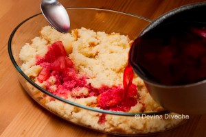 - Empty the water from the fuit can over the crumbled cake