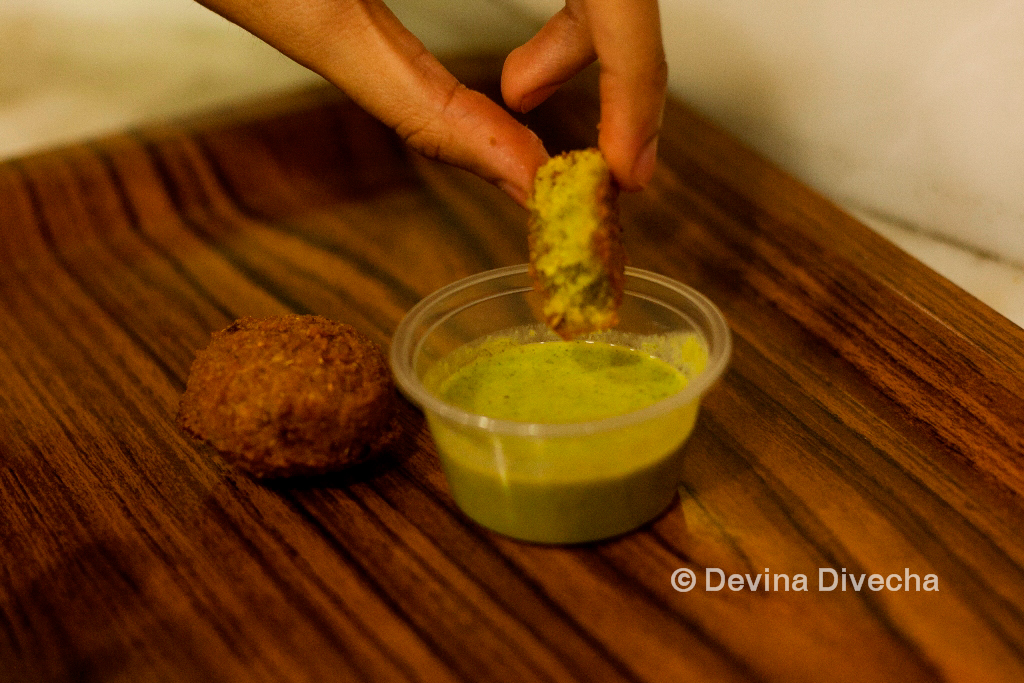 When the server realized we were going to sit there, at least for a while to munch on them little chickpea globes, she gave us a kind os spicy minty dip, which we used. My, oh my, did it add a nice spice kick! What Farah called a mature taste, these falafils were really, really good. A nice crunch to it, it tasted good on the inside. I’m guessing the dip added a kind of sub-continental flavour to the food [Location].
