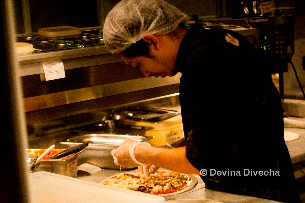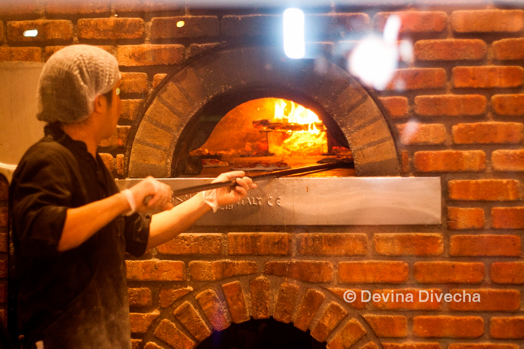 The pizza…ooohhh…the wood-fired up pizza! I watched them make the pizzas with aplomb, and distracted them a bit with my flash before abandoning it altogether (thanks for the very practical and logical suggestion Wajiha!) and clicking without. Watch: