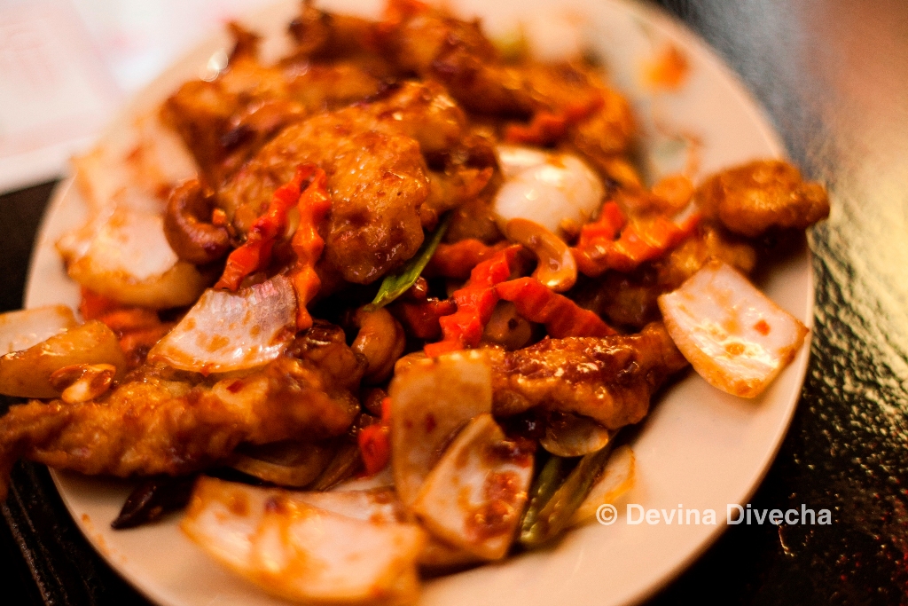 This was average; we asked for this one to be very spicy, but clearly MM and I have heightened senses of spice tolerance, because we hardly felt it pinching our spice nerves. But I’ve a feeling those who can’t handle spice are better off asking for a medium or not spicy dish (will point out here that each dish can be ordered according to your level of spice). Where the meat or veggies were swimming in the sauce at the bottom of the plate did I find happiness – there the spices really mingled with the food and made me a happy person indeed.