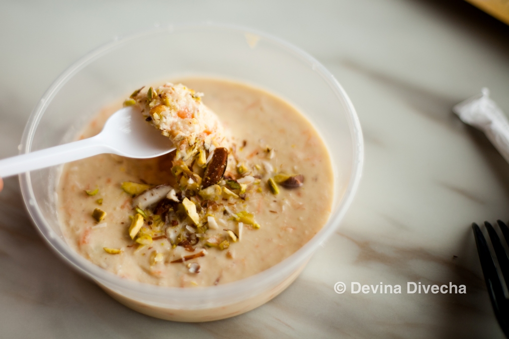 Then we returned to our table… because the food wasn’t over! We tried the gajrela, a quirky mix of gajar ka halwa and kheer. I really, really, really loved this one. I wish I’d had more place in my already stuffed tummy to have more that day, but John more than made up for my tummy’s reticence.