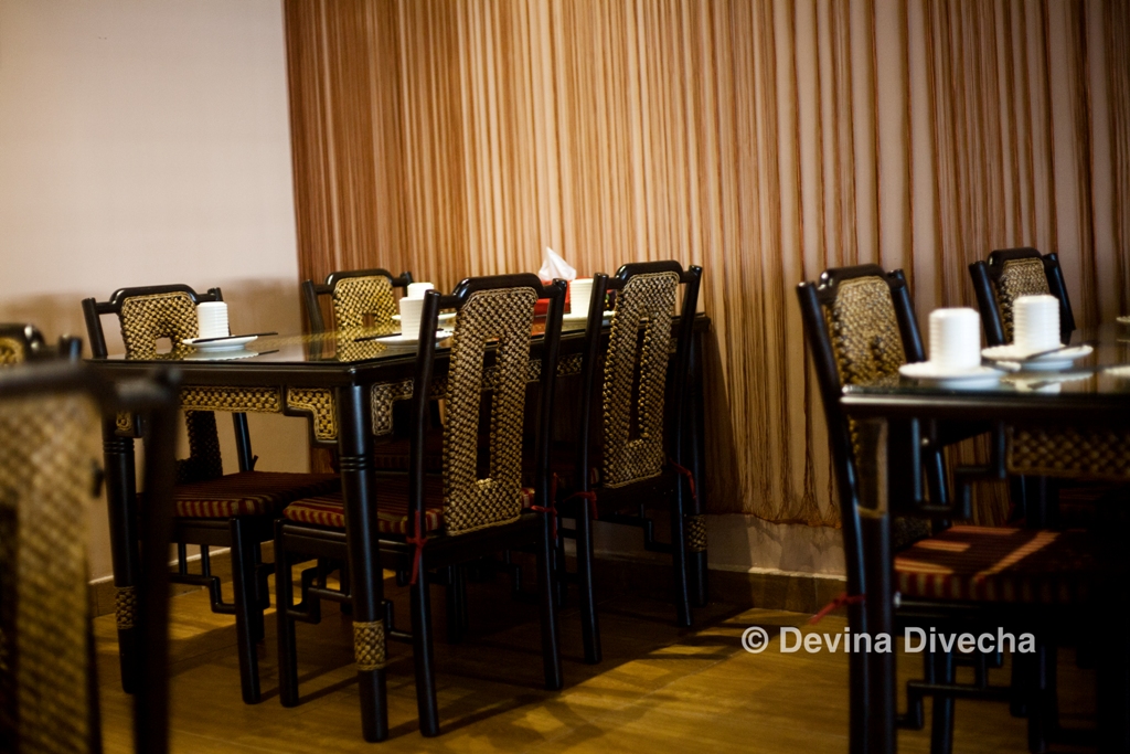 Woody, earthy tones surround us amidst splashes of vivid red, with straight-backed comfortable chairs alongside tables that have an interesting table-top design staring at you. What looks like wicker entwined with bamboo fibres merge together in hypnotic concentric circles, encircling the massive Chinese symbol for the restaurant, 家, which means “family” or “home” in Mandarin.