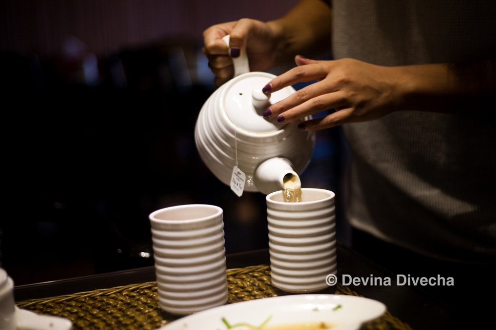 We were given some green tea in ceramic mugs, while we pored over the menu. And then we began ordering…