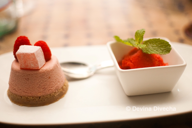 For dessert, I went with raspberry and rosewater cheesecake (what an unusual combination, I thought!) and was pleasantly surprised when it came with a raspberry sorbet, which I thoroughly enjoyed too. Crumbly cheesecake, with the slightest hint of rosewater, topped with two raspberries… it was nice.